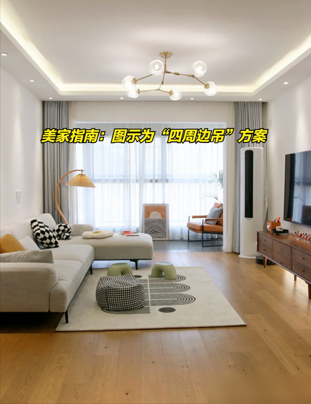 双眼皮吊顶就是两块石膏板错3公分走一圈,不压层高还显利落,造价只要复杂吊顶的1/3;四周边吊更简单,用石膏线收个边,搭配射灯一照,氛围感直接拉满。